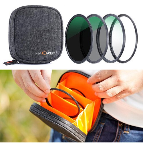 The K&F Concept Nano-X Series Magnetic 3-Filter Kit (82mm) offers a convenient magnetic system for quick filter swaps on compatible lenses. It includes a UV filter for protection and haze reduction, a circular polarizer (CPL) to cut glare and enhance colors, and an ND1000 filter for 10-stop light reduction to enable long exposures or shallow depth of field.